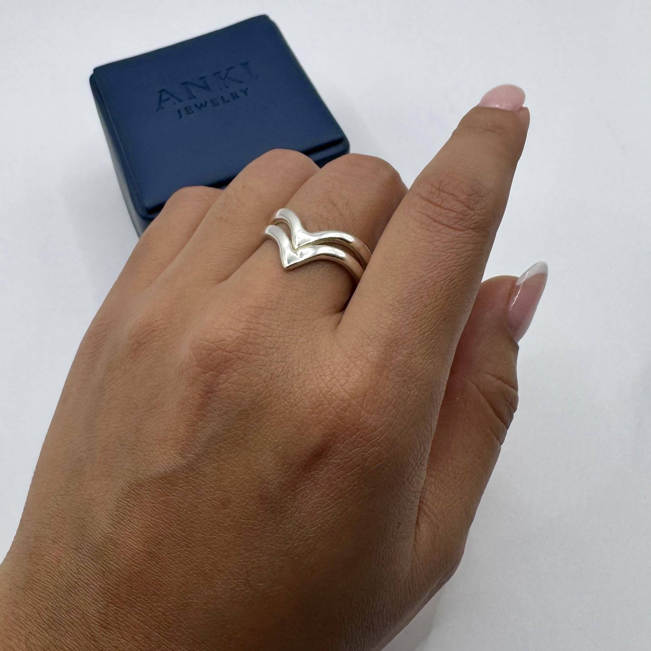 Anillo en plata 950 con diseño doble V, que representa la unión de caminos y la armonía interior.