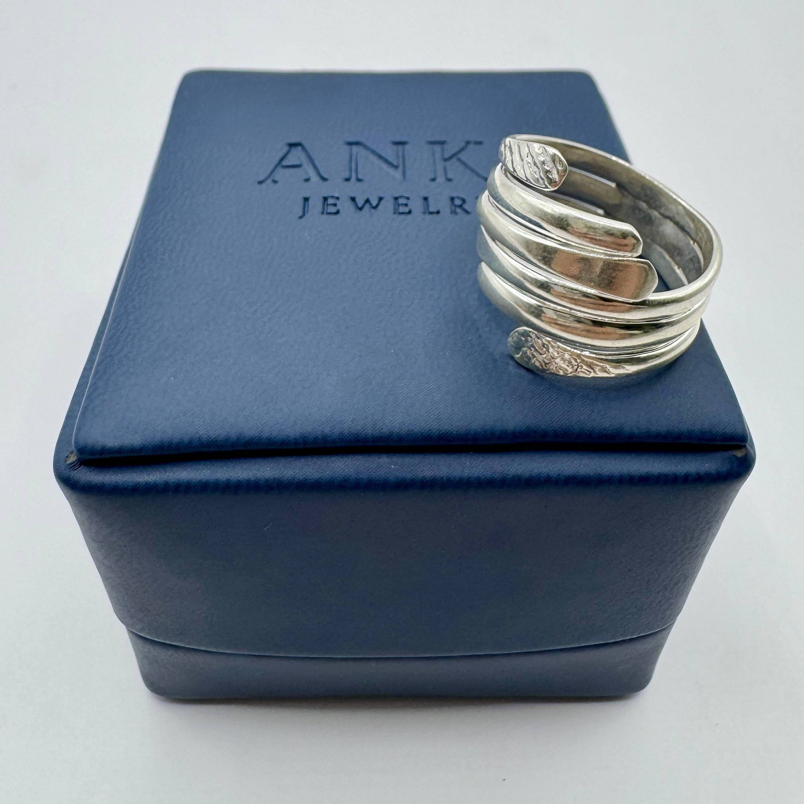 Anillo elaborado en plata 950 con forma enroscante que aporta movimiento y fluidez. Diseño sobrio y contemporáneo.