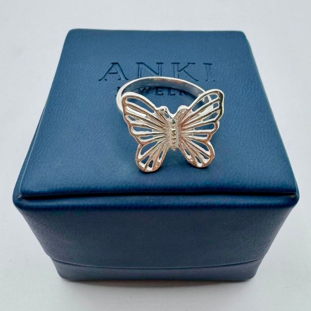 Anillo elaborado en plata 950 con mariposa de líneas delicadas. Representa transformación y ligereza con un acabado fino.
