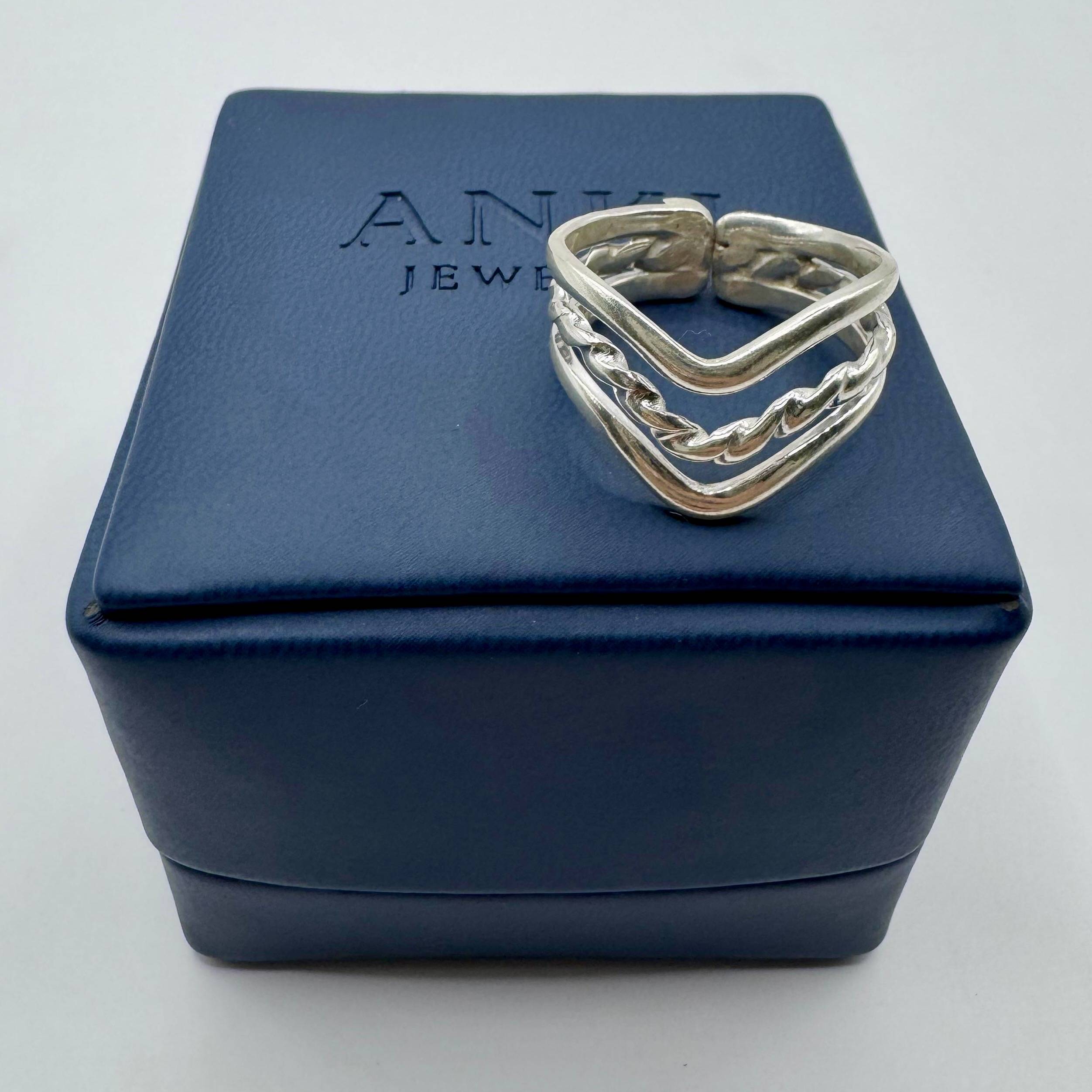 Anillo de plata 950 que fusiona el diseño en V triple con un acabado entrelazado, logrando un equilibrio entre fuerza y elegancia.