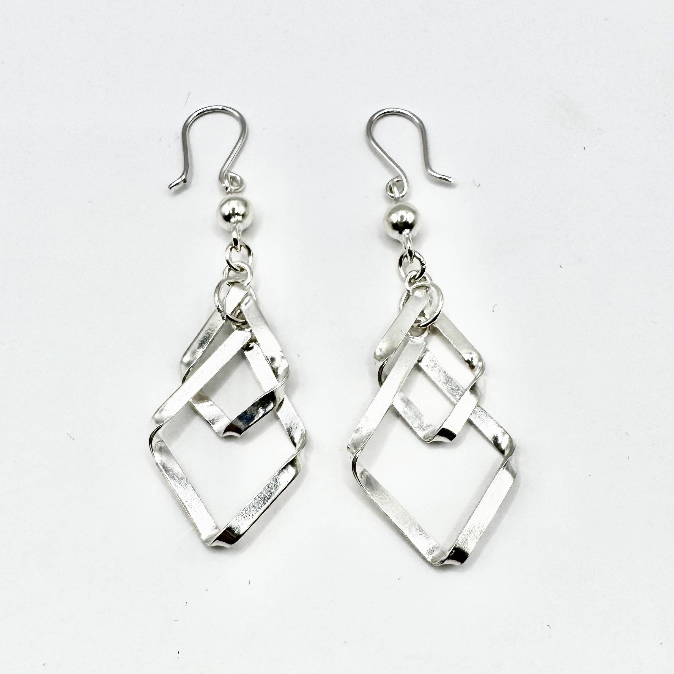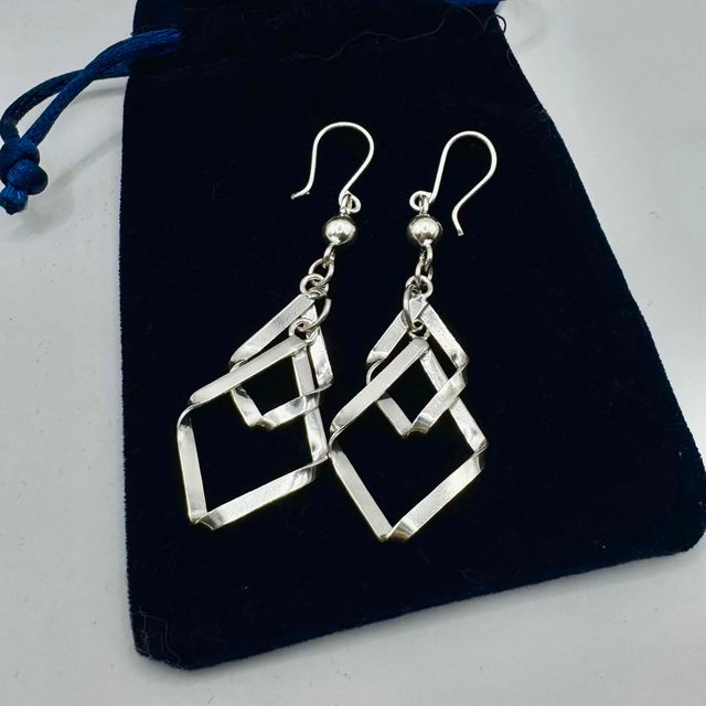 Aretes colgantes en plata 950, de diseño moderno y geométrico. Los rombos entrelazados aportan un toque de elegancia contemporánea.