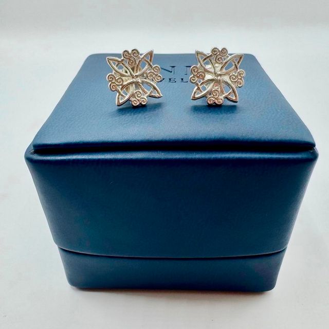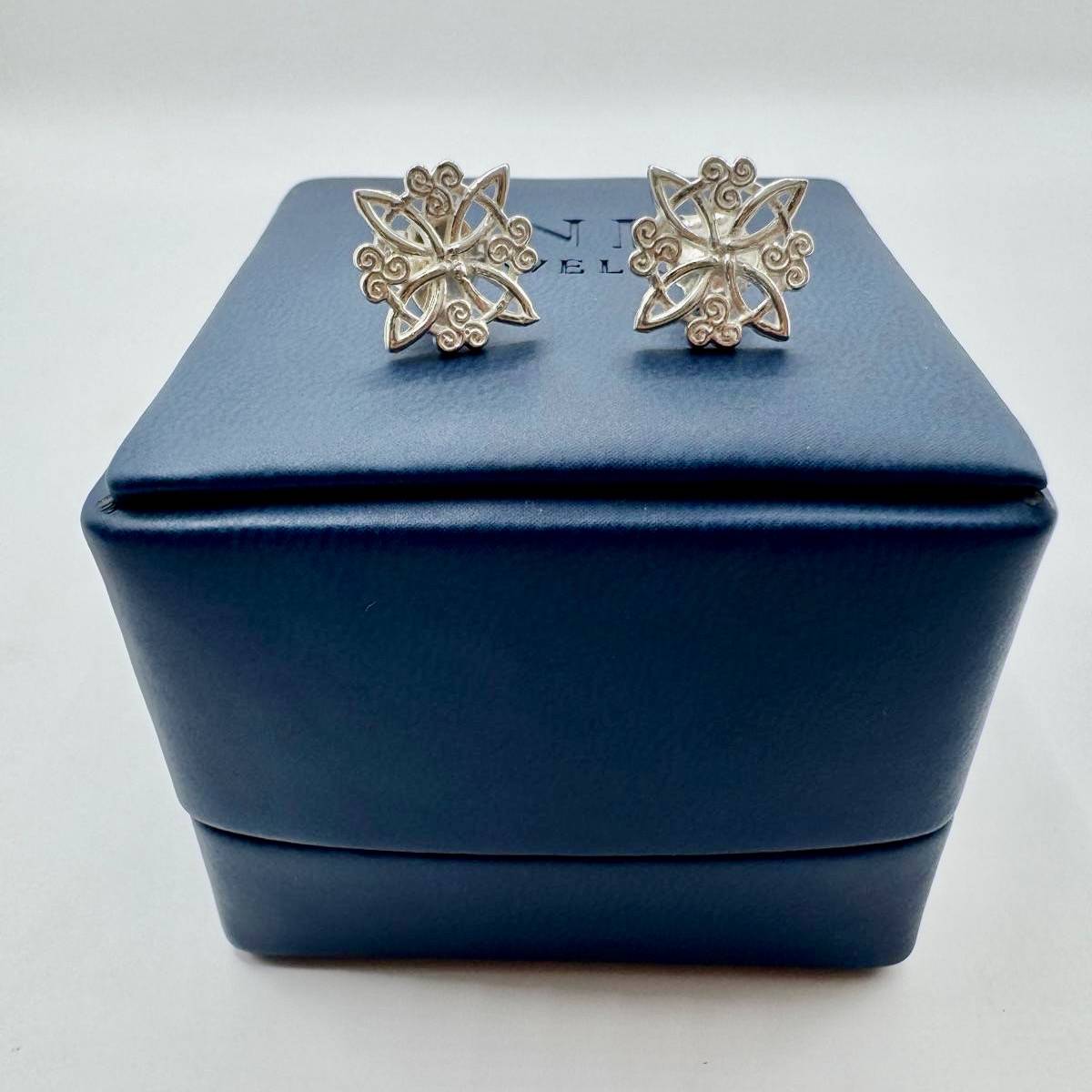 Aretes de plata 950 con nudo de bruja en espiral, símbolo de protección. Diseño sobrio y refinado.