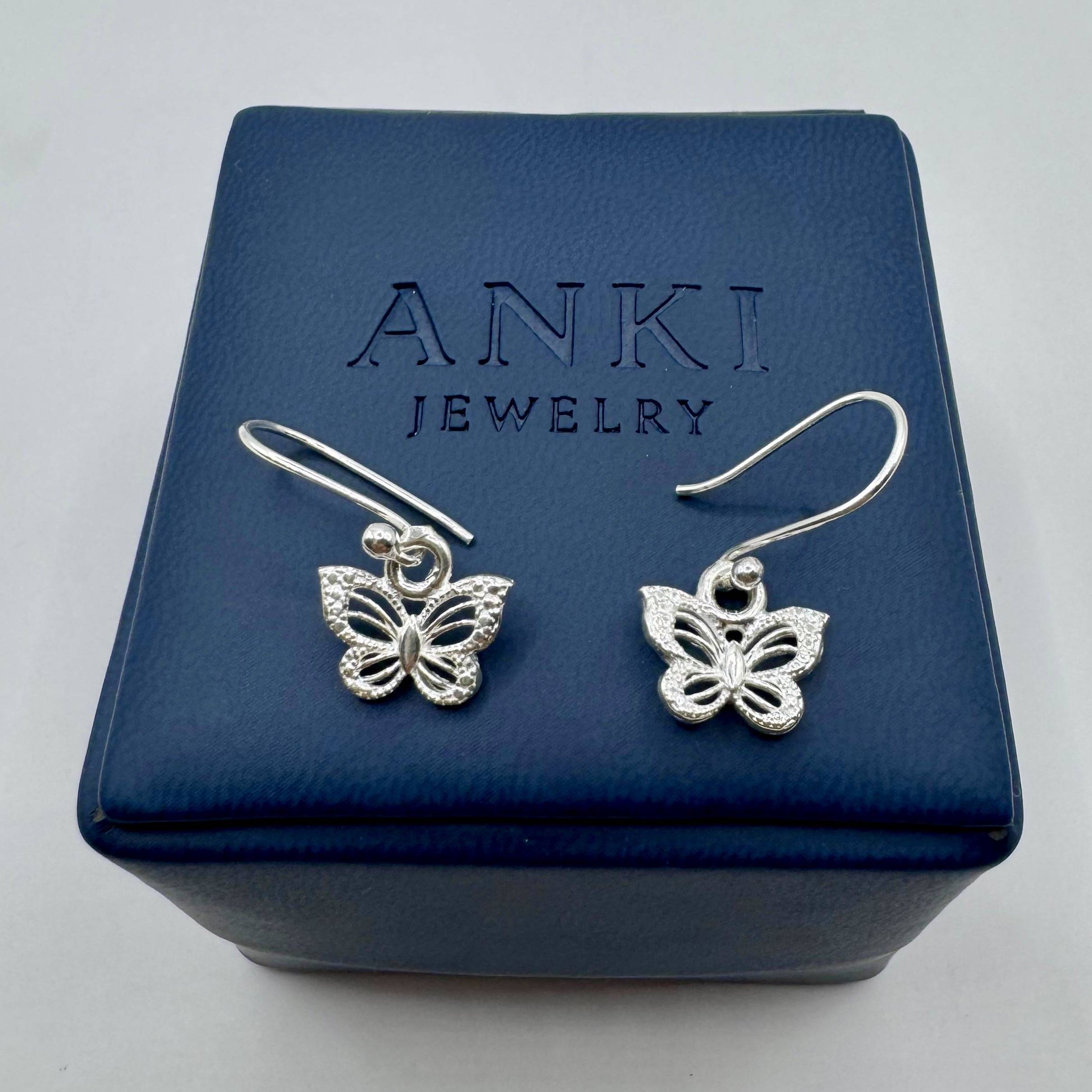 Aretes colgantes elaborados en plata 950 con mariposa. Diseño ligero y elegante con caída suave.