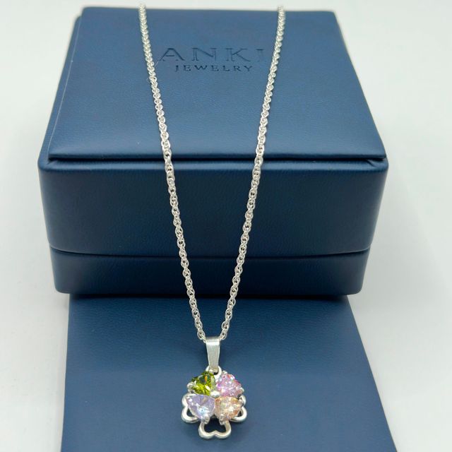 La flor giratoria, símbolo de movimiento y renovación, brilla en plata 950 y se acompaña de una cadena en plata 925 de 50 cm.
