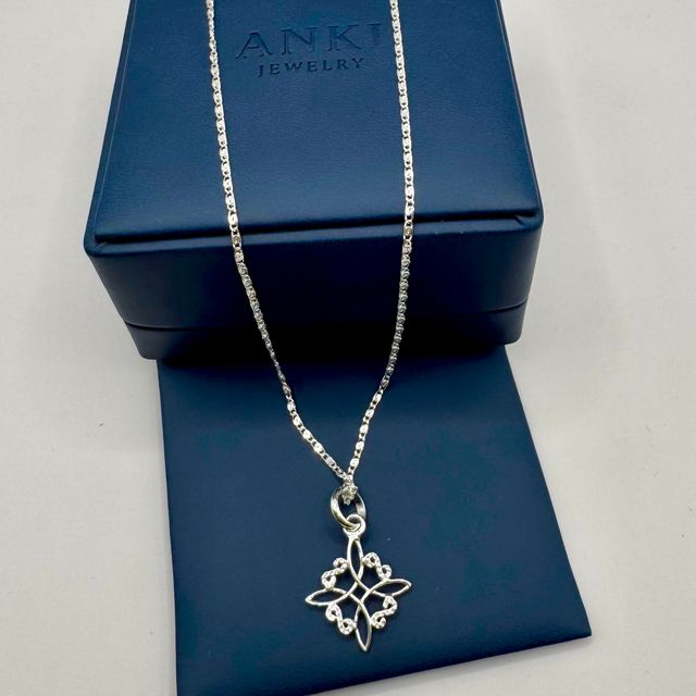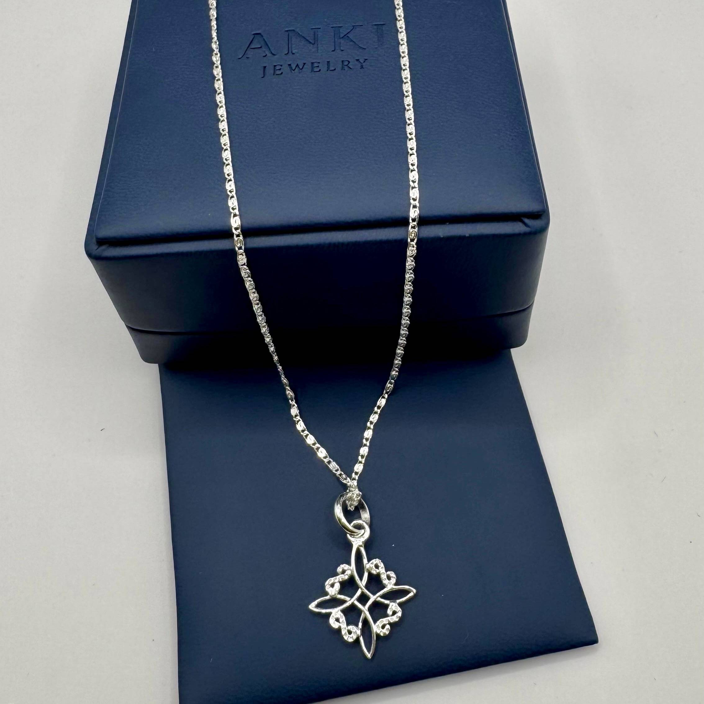 El nudo de bruja, símbolo de protección y energía femenina, elaborado en plata 950 y acompañado de una cadena en plata 925. Largo: 50 cm.
