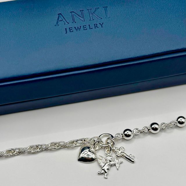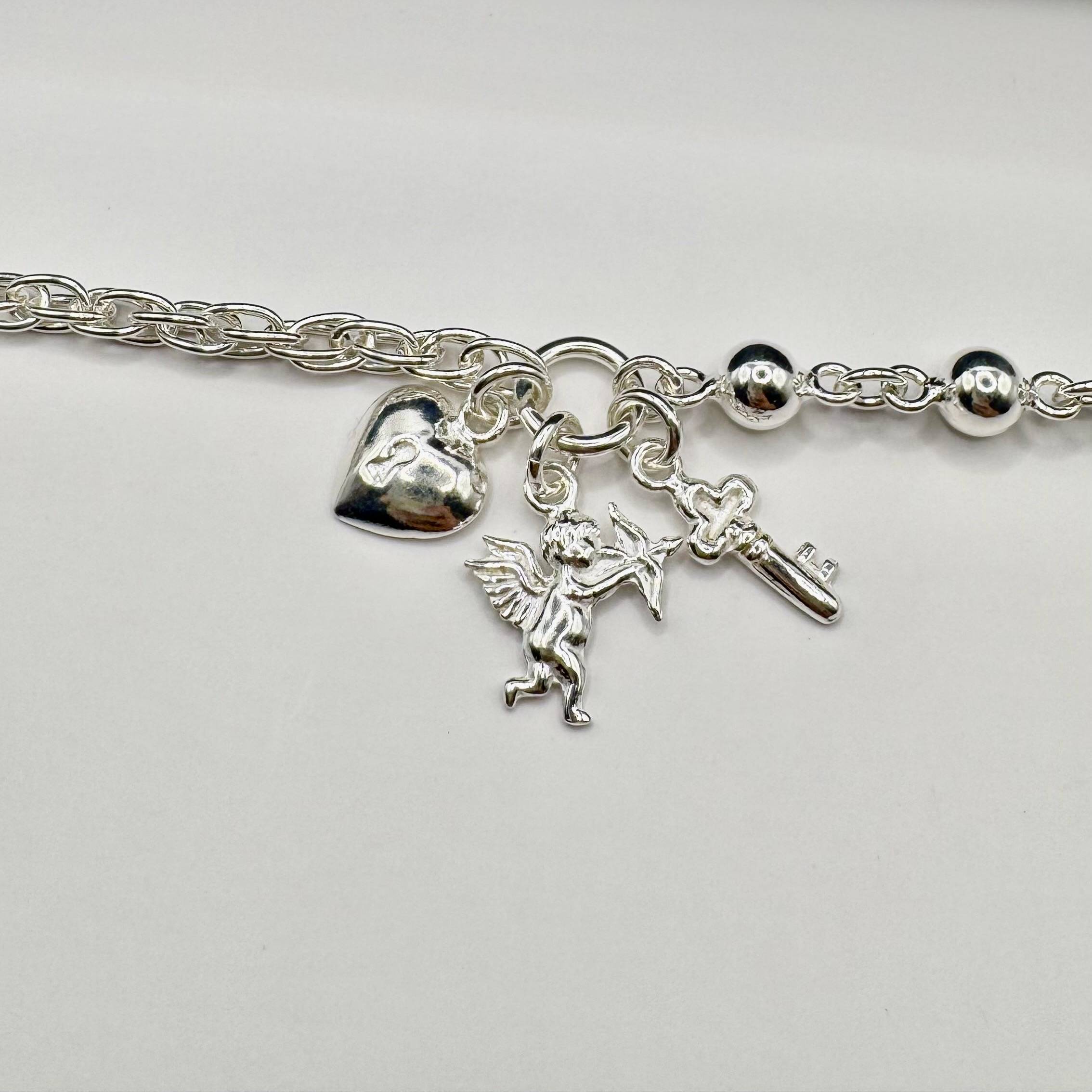 Pulsera en plata 950 con dijes simbólicos: ángel, corazón y llave. Representa protección, amor y apertura de nuevos caminos.