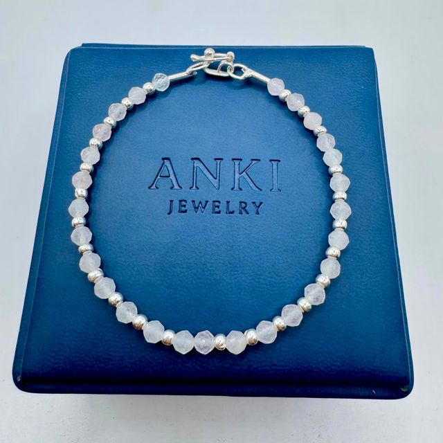 Pulsera con piedras naturales de cuarzo rosa. Detalles en plata 925. Color rosado suave.
