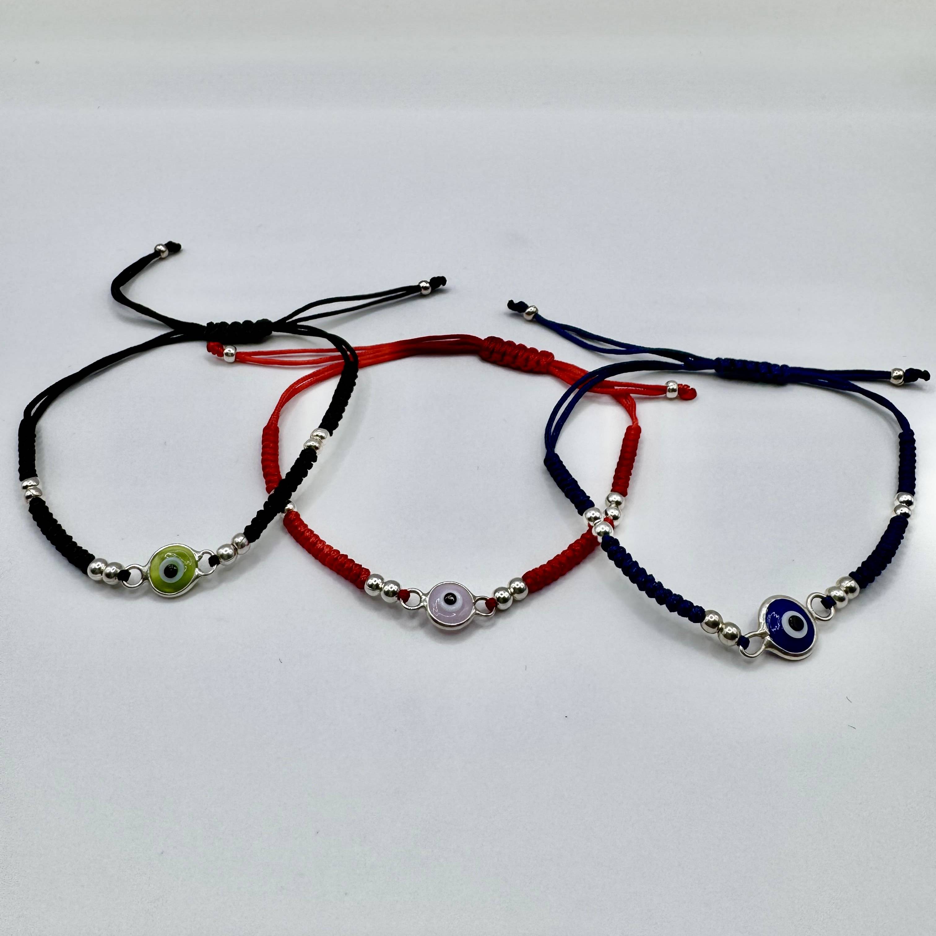 Pulsera de hilo ajustable con dije de ojo turco en plata 950. Diseño resistente, minimalista y lleno de intención.