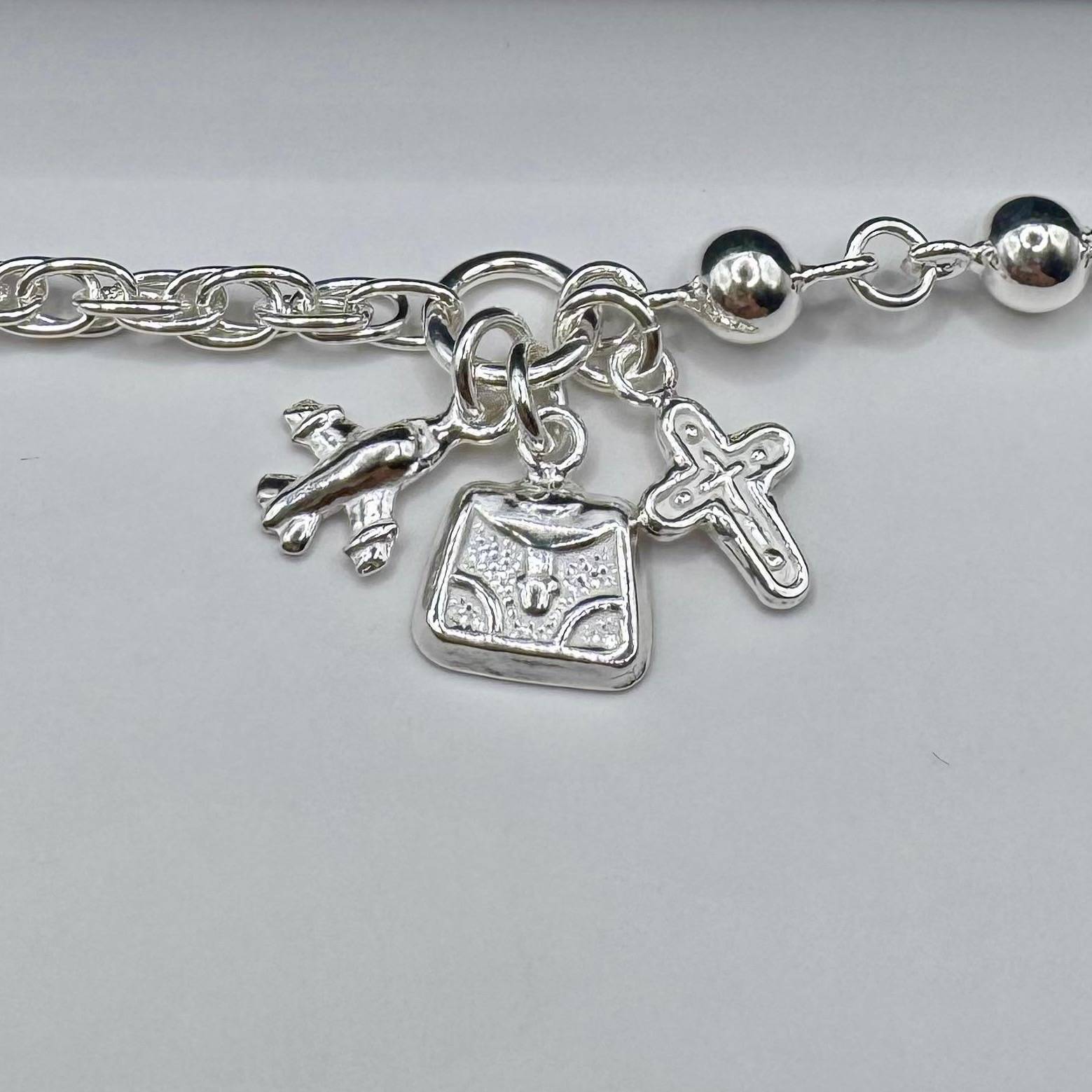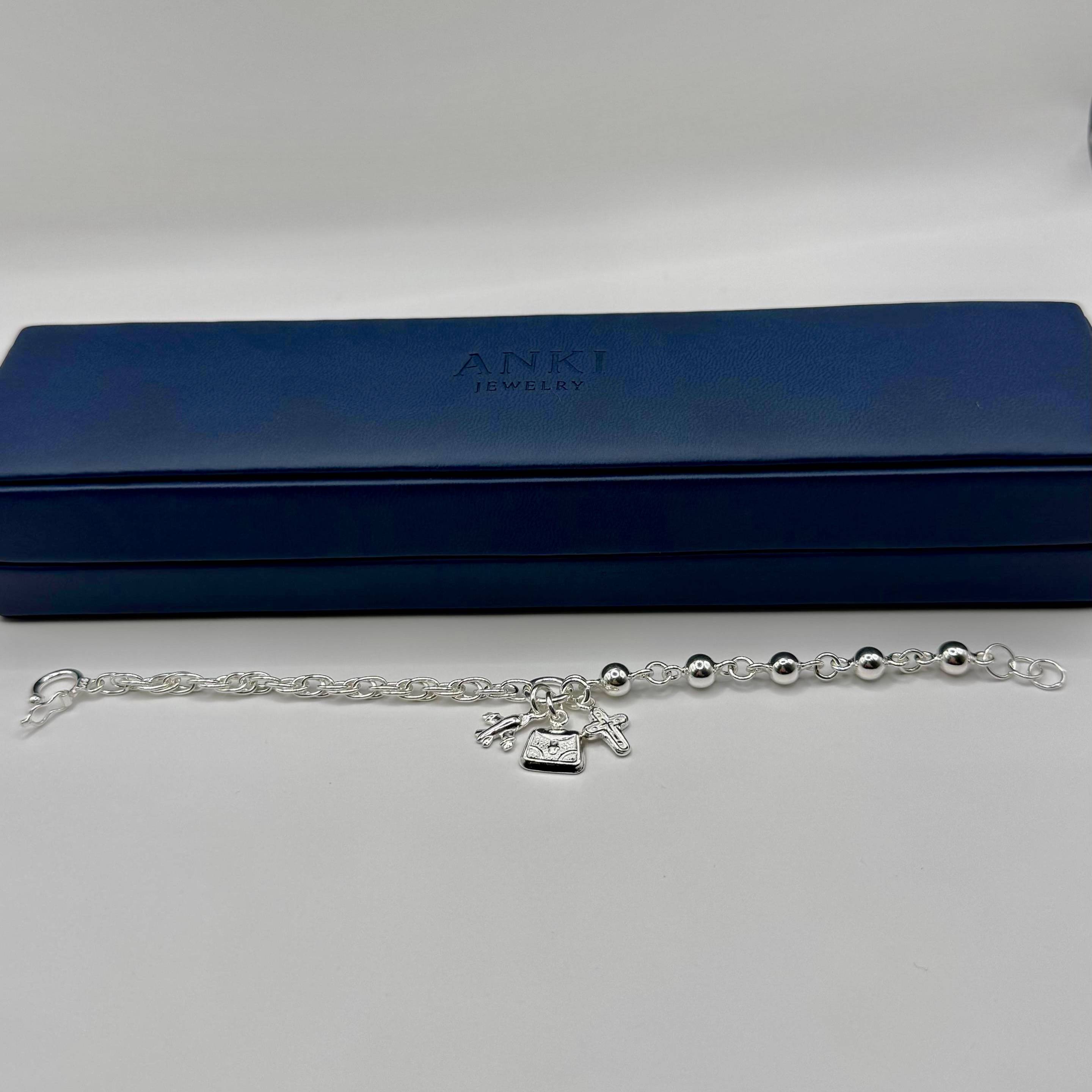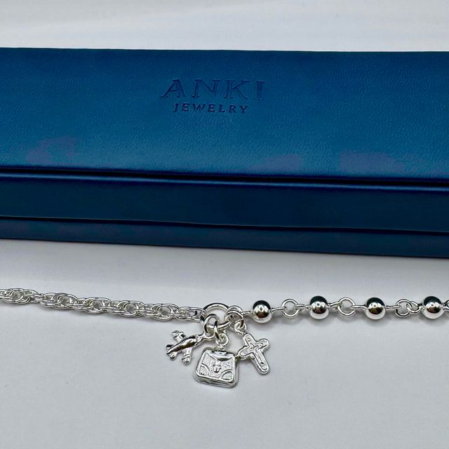 Pulsera en plata 950 con dijes de maleta, cruz y avión, perfecta para espíritus viajeros. Representa la fe en el camino, la pasión por descubrir y la libertad de volar hacia tus sueños.