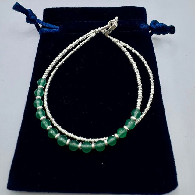 Pulsera doble confeccionada en plata 950 con piedra verde agua. Una pieza fresca y luminosa que transmite calma y elegancia natural.