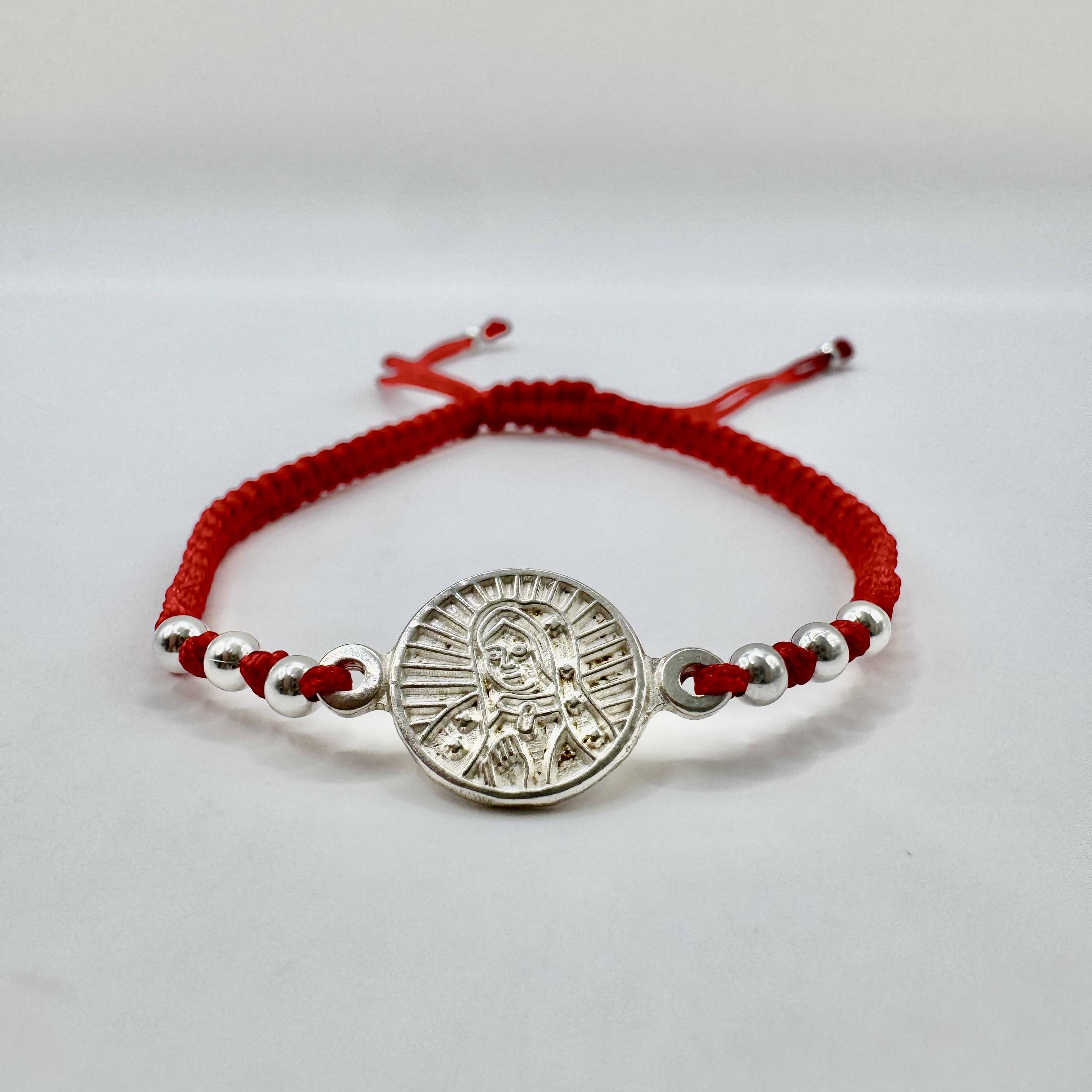 Pulsera de hilo con dije de la Virgen de Guadalupe en plata 950. Regulable, resistente y símbolo de fe y protección.