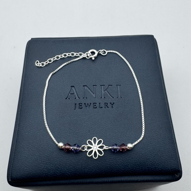 Una flor delicada y pequeñas piedras moradas que aportan un toque femenino y elegante Ver más detalles