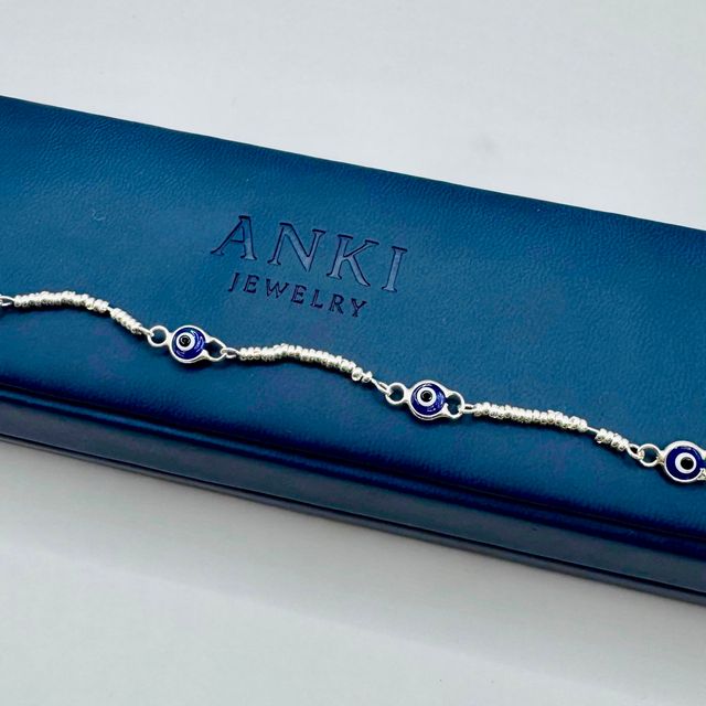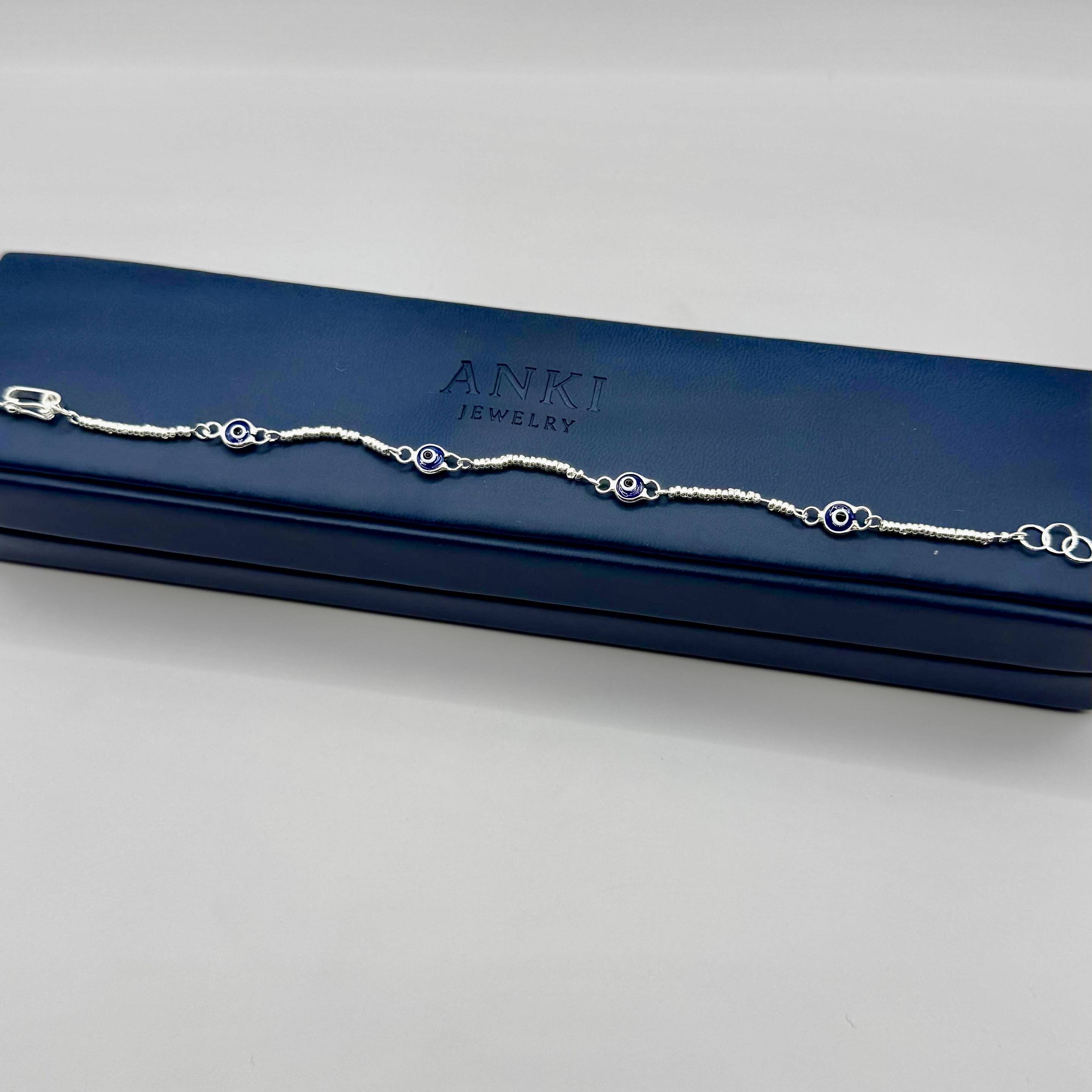 Pulsera estilo Shakira en plata 950 con dijes de ojo turco azul, símbolo de protección y buena energía.