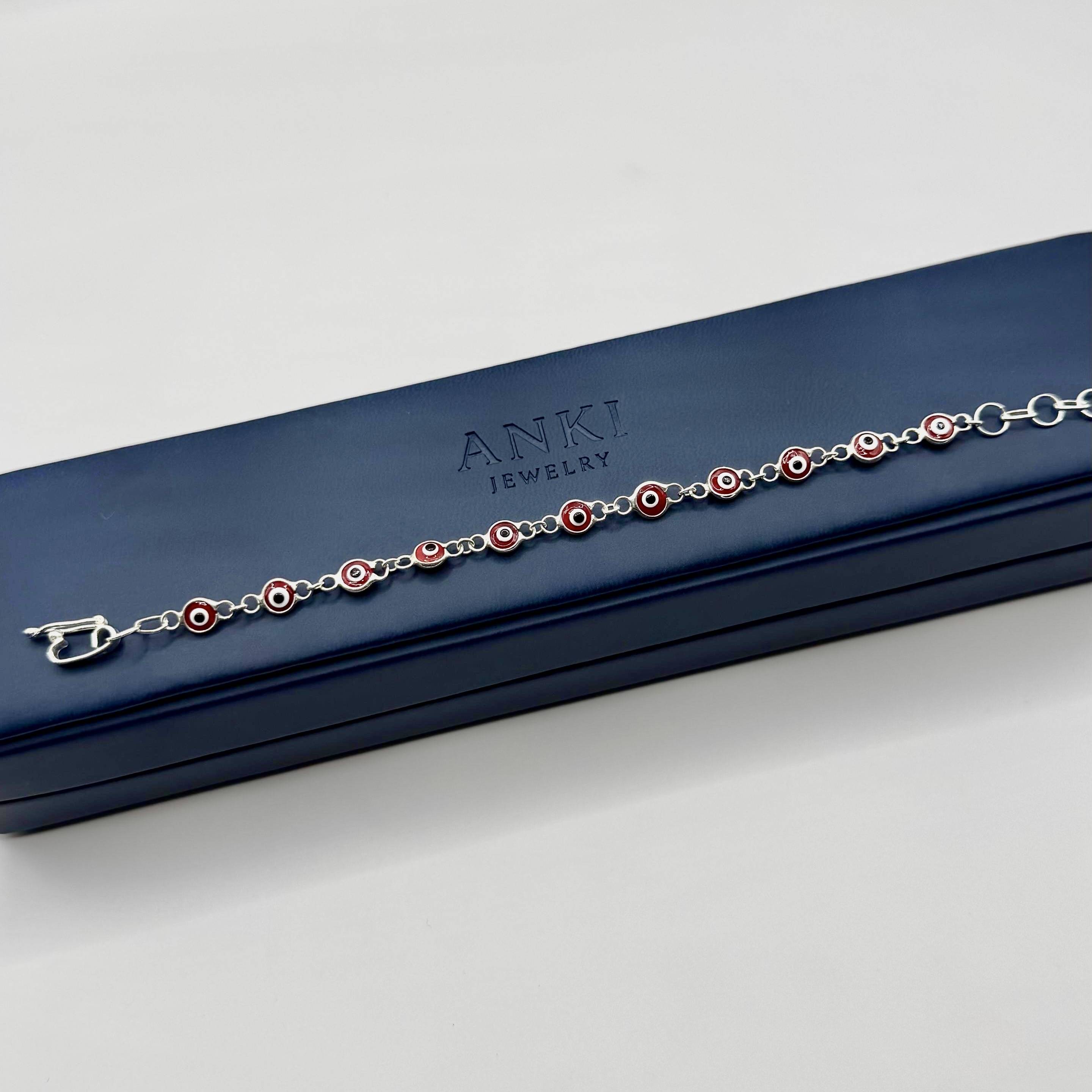 Pulsera en plata 950 con dijes de ojo turco rojo, amuleto que protege de las malas energías y atrae fuerza interior, pasión y confianza.
