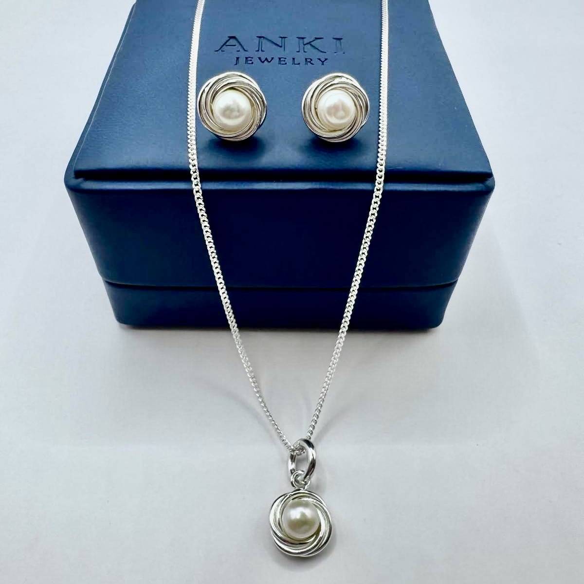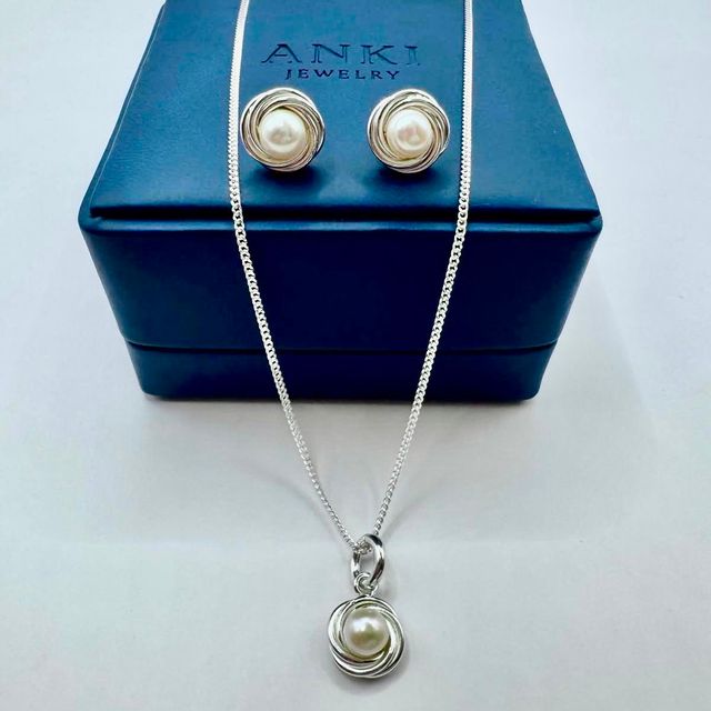 Juego completo en plata 950 que incluye aretes florales y dije con perla de río en cadena de 50 cm. Una combinación clásica y sofisticada.
