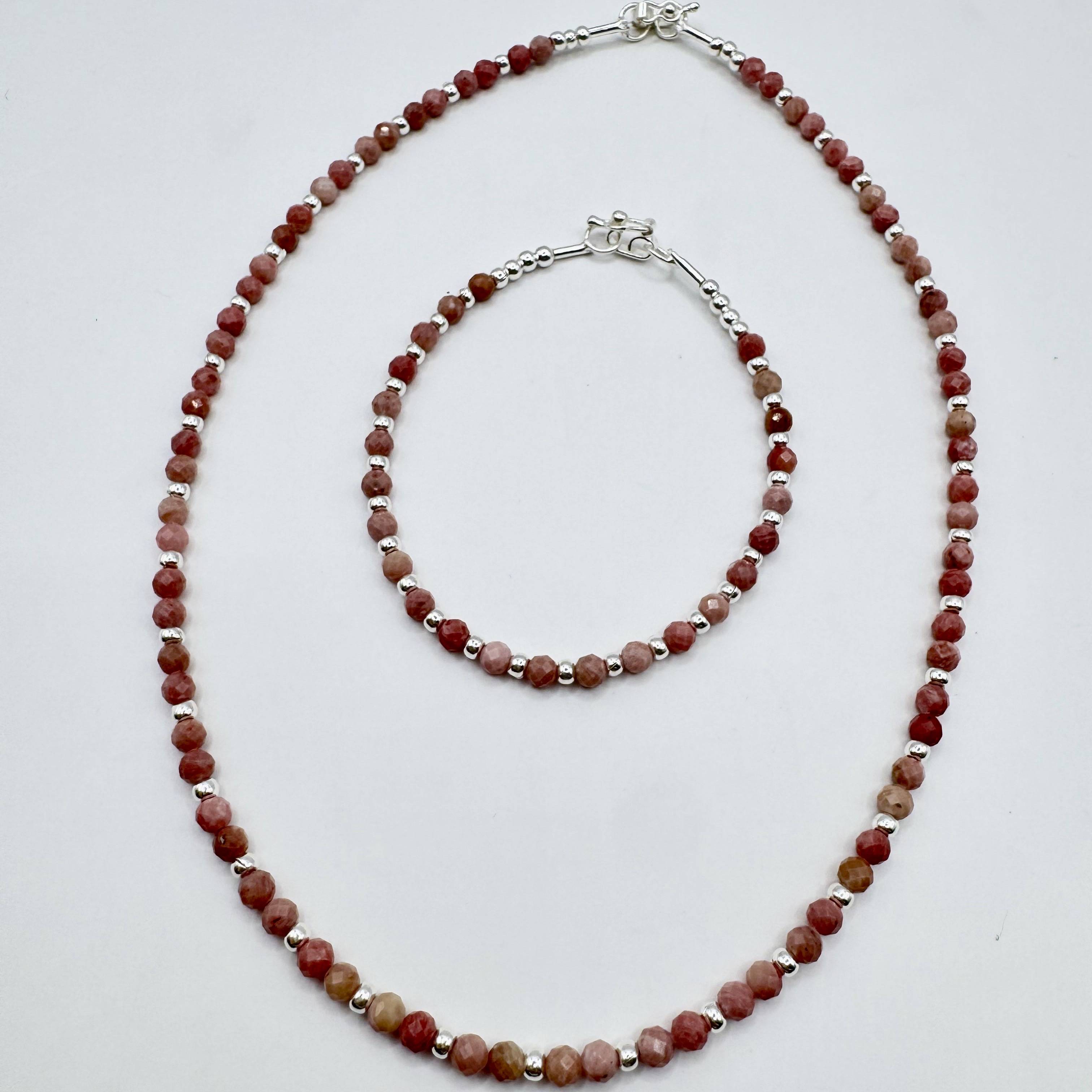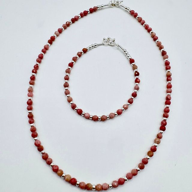 Plata y piedra natural rodonita. Incluye pulsera y collar · Acabado brillante. Estilo romántico y delicado.